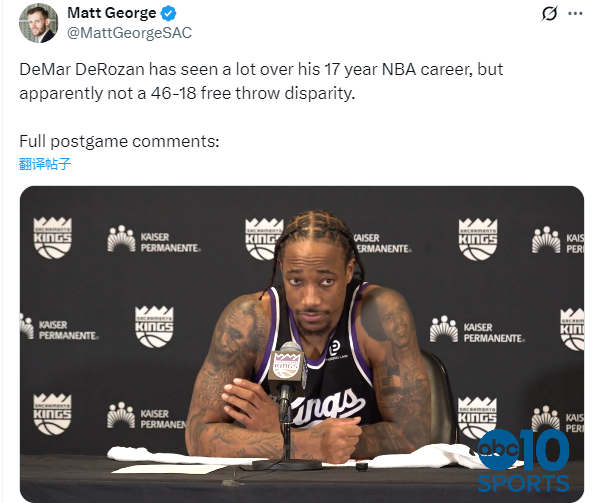 “你觉得是你们防守方式的问题,还是比赛吹罚的问题?”记者问;德罗赞回答道:“我不知道。我得回去看看,但就像我说的,46 次罚球,太疯狂了。这太疯狂了。你们看到了,这显然对于奥斯汀-里夫斯来说是美妙的夜晚。”